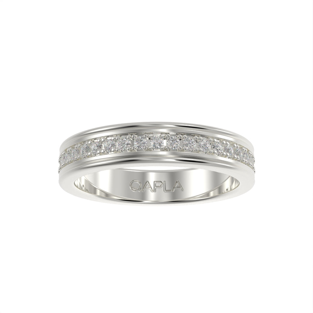 This wedding band features pavé stones elegantly set along half of the band, creating a continuous sparkle. At the edges of the band, beautiful details enhance its beauty, adding a touch of sophistication and craftsmanship. The combination of pavé stones and detailed edges creates a stunning and timeless design, symbolizing eternal love and commitment.